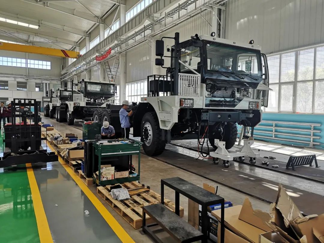 ▲諾浩機(jī)電公司礦用新能源寬體車生產(chǎn)車間工人在工作中
